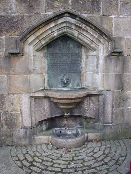 - Lancaster Castle external walls near to the courts entrance. This public fountain was erected in 1888 in celebration of Queen Victoria’s Golden Jubilee the previous year. The commemorative plaque is still present, along with lion spout, bowl and trough although the water no longer flows.