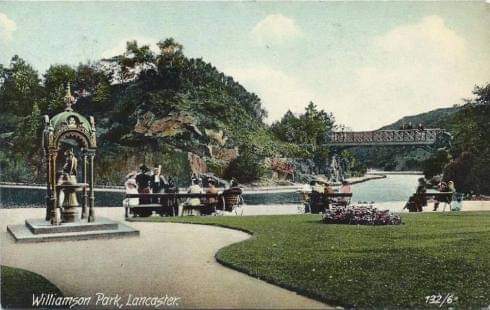 - Williamson park, in front of the lake. This once grand, canopied drinking fountain was built c.1890 as part of James Williamson (Lord Ashton’s) scheme, continuing his late father’s plans. The canopy was removed in the 1940s and by the 70s a basic municipal public fountain was installed. Today all that remains is the square plinth. Several examples of the original Victorian fountain still survive in Scotland where they were made.