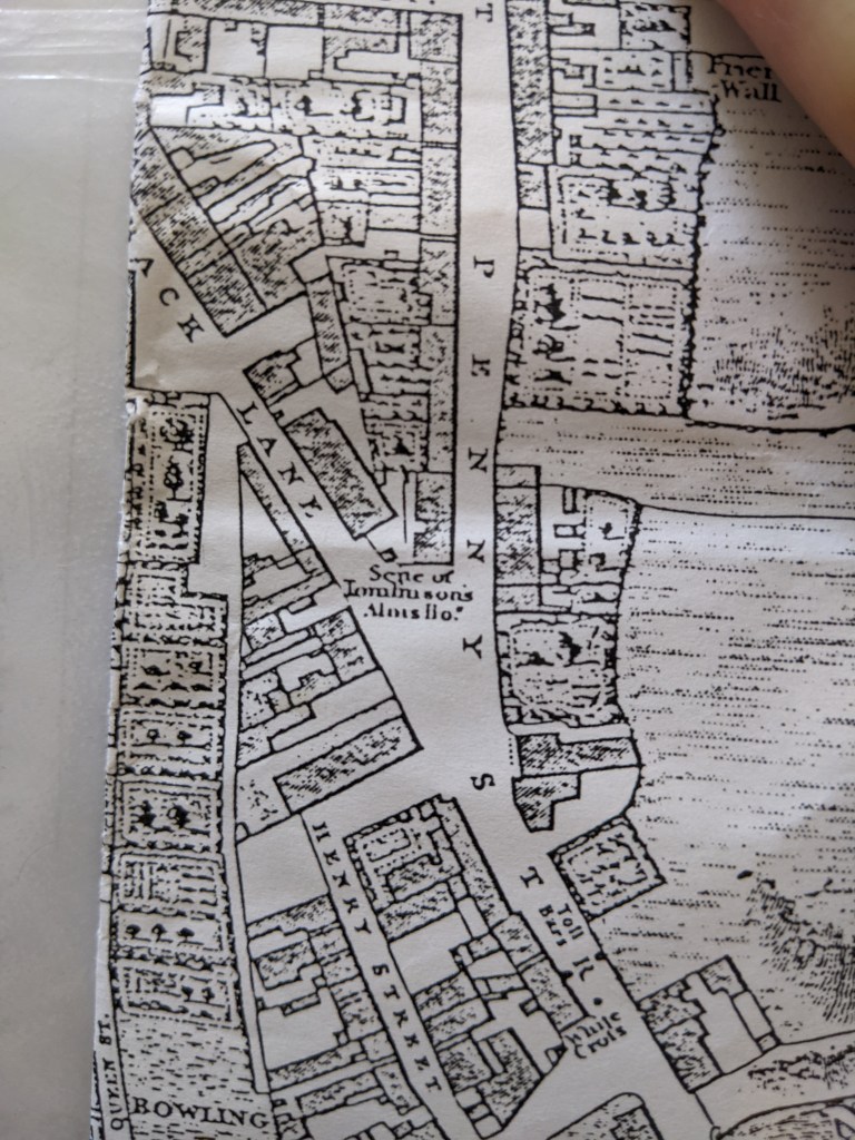 - Penny Street- Townsons Almshouses- It is not known when this early group of 6 cottages by the White Cross were built or even who endowed them but they were demolished around 1812 because it was felt they projected into the road too much. They can be seen on Docton’s map after Kuerden 1684/5, Mackreth’s 1778 and show as ‘site of’ on Binn’s 1821 map, labelled incorrectly as Tomlinsons almshouses.