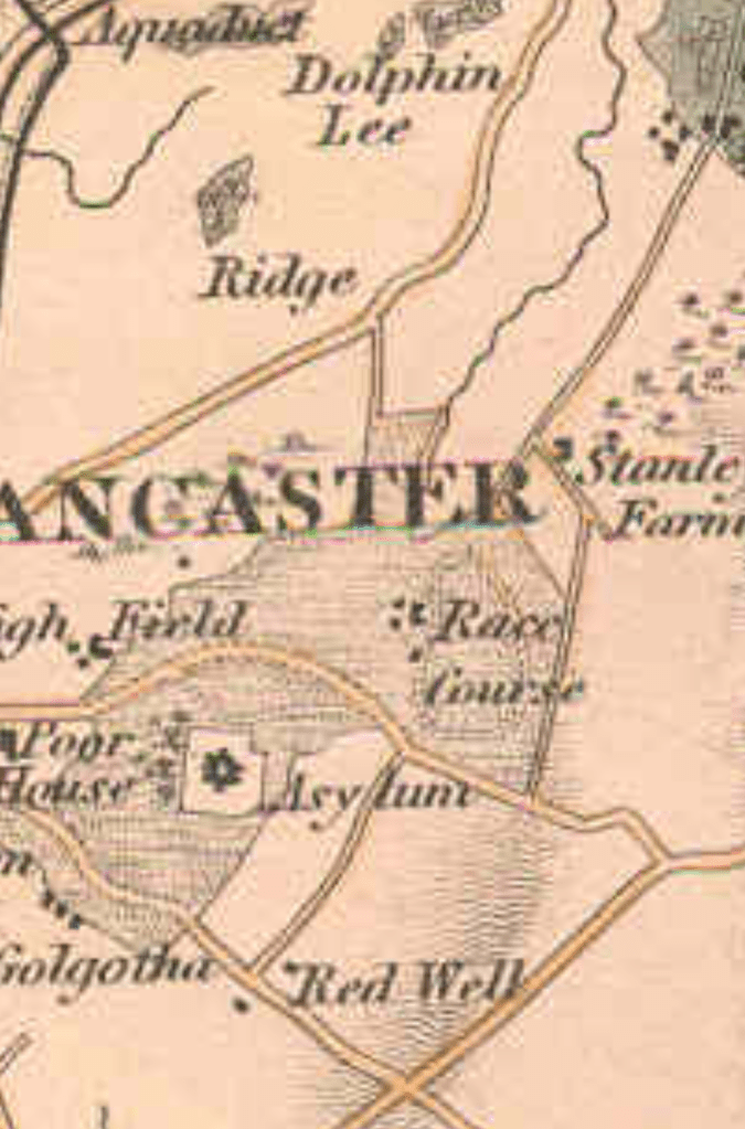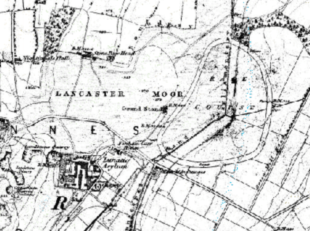 The site of the old Marsh Racecourse was later built upon by Lune Mills and extends under what today is the Lune Industrial Estate, modern housing developments and Freeman’s Pools nature reserve. Development of the County Lunatic Asylum (Moor Hospital) Annexe and later the M6 motorway cut through the old racecourse on the Moor but did you know that LiDAR scanning still reveals much of the course? See if you can spot it…