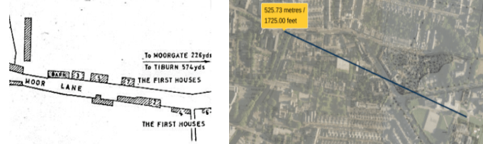 Moor Lane. As the crow flies there are indeed 574 yards (525m) from the first houses to the