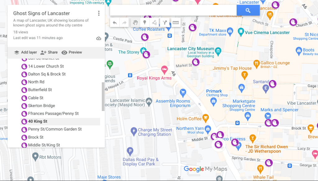 Today is Halloween, so what better time to launch the map that I’ve been working on that locates all the ghost signs (historic remnants of painted signs, adverts and names) in Lancaster. The interactive map shows all (current) known ghost signs and photos where possible.