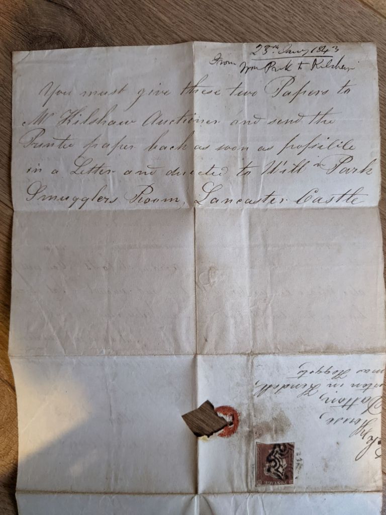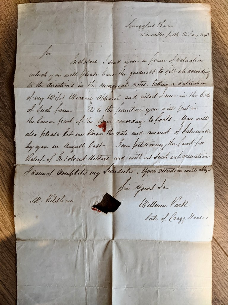 This week I took receipt of a letter, written in January 1843 by a man, William Park, who was imprisoned in the debtors’ cells at Lancaster Castle. The letter is formed of only one piece of paper, sealed, so no envelope was needed.