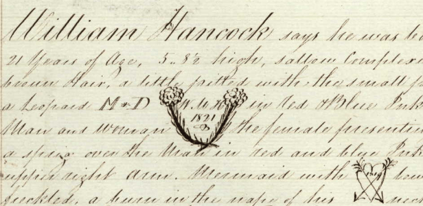 Lancaster Castle Gaol records from 1820-1826 capture detailed physical descriptions of the 2000 or so prisoners tried or held in the prison during this short window. Part of these descriptions are of the design and body placement of any tattoos found on them.